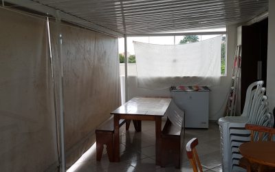 Ampla varanda no piso superior, com churrasqueira coberta, fechamento em vidro e toldo retrátil, perfeita para momentos de lazer