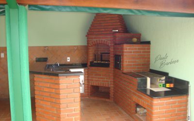 Parte externa com mais um quarto, banheiro, área gourmet com churrasqueira, forno e fogão à lenha e quintal gramado.