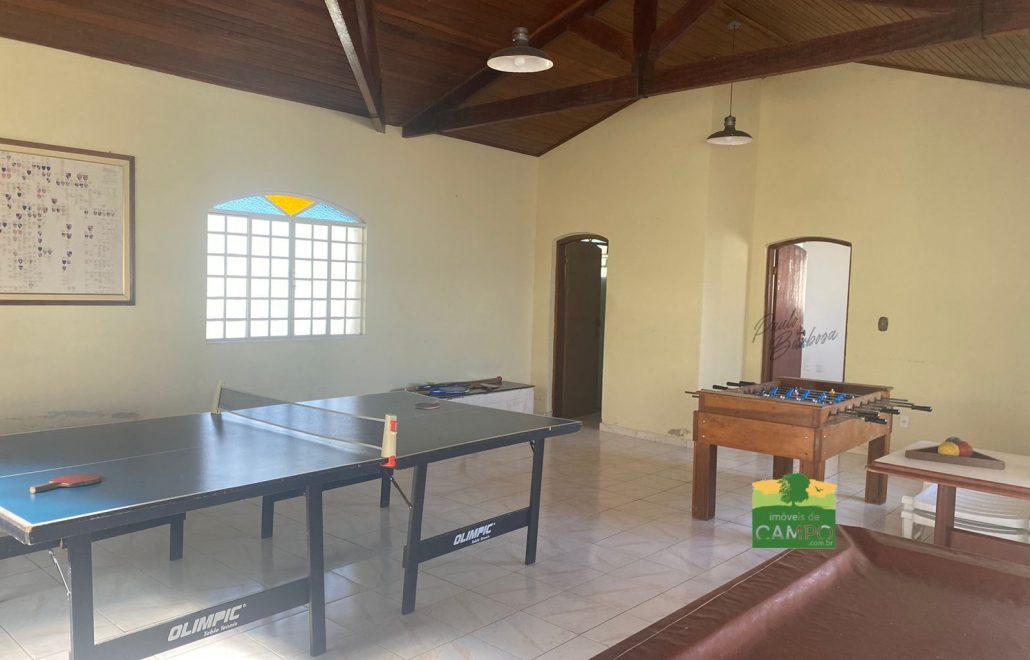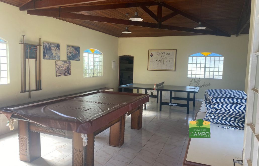 Salão de jogos com mesa de sinuca, pebolim, ping-pong, quarto e banheiro.