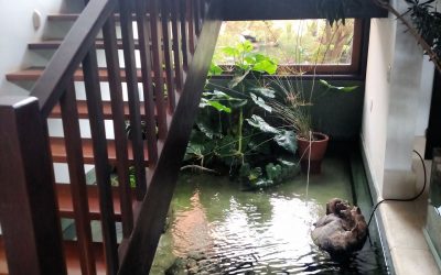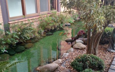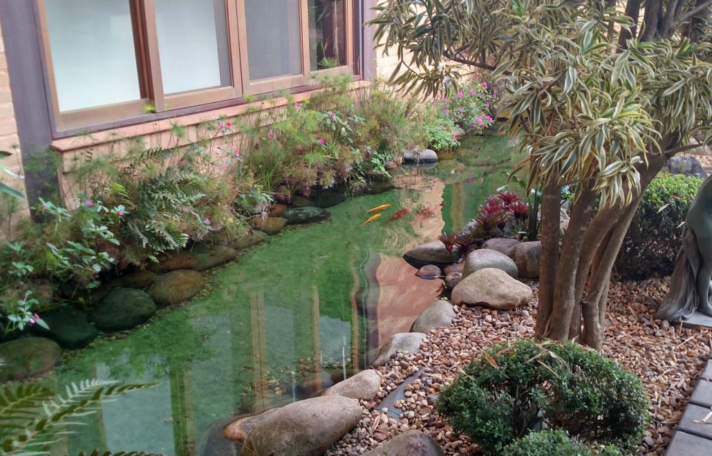Jardim interno com lago para carpas